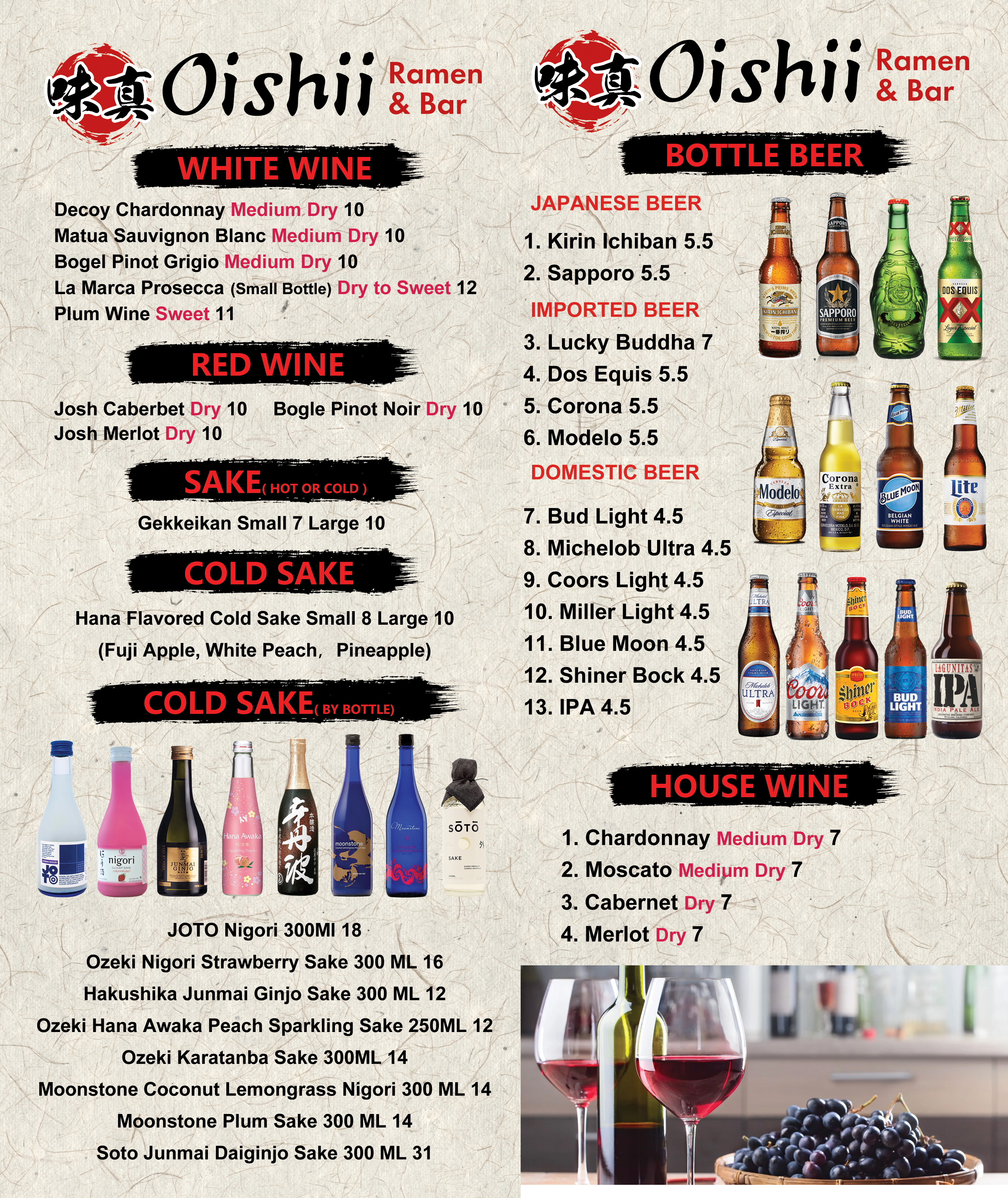We have prepared Japanese imported sake, beer, Japanese imported beer, white wine, red wine, special Japanese drinks, fruit-flavored sake, etc.